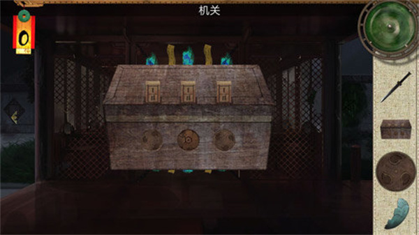 2、到大堂里面 ,就是有个铁链,锁着一个面具的地方开启盒子可以获得另外一个面具。把木盒放到面具前,然后把抽屉找到的圆圈放上去,旋转调整高度,把三个调整到最好就可以了。