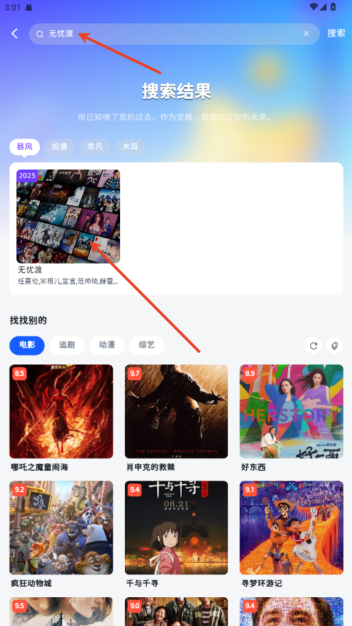 2.输入影视剧名称点击搜索,出来搜索结果,点击对应影视,开始观影。