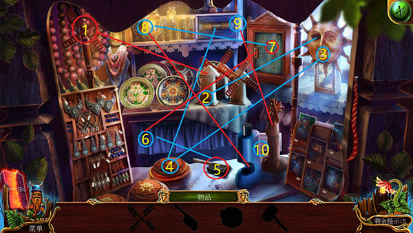 后退两步回到大门场景。点左手星1柜子,按密码打开柜子寻物(这张好难表示,但按序号步骤应该能懂,小游戏略)。最后得到地图硬币。