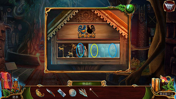 进入地下室。点左侧星1,放入老者面具,牛角面具,奇怪面具,完成小游戏,用手镯解锁,得到木制手臂。