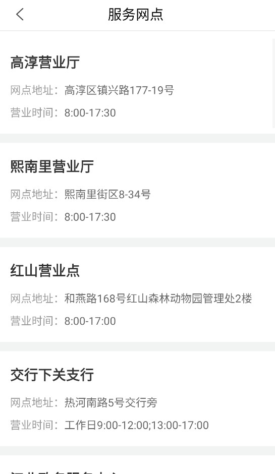 4、点击“服务网点”可查询高淳、照南里等各区域营业厅地址及营业时间。