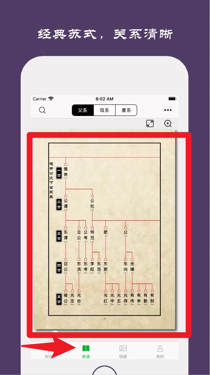 2. 进入首页后选择「册谱」页签,可查看经典竖式族谱结构,按代排列,族系一目了然。