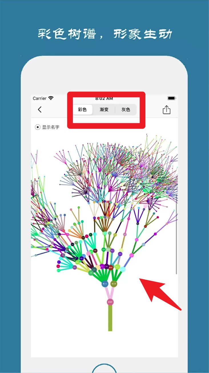 4. 在「树谱」页面点击样式选项,可切换彩色、渐变、灰色族谱树,呈现方式更具仪式感。