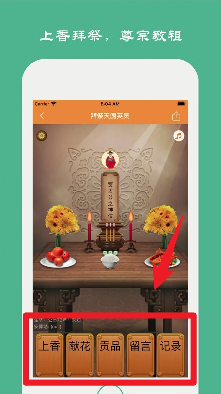 5. 拜祭功能区提供上香、献花、留言等操作,用户可在线缅怀祖先,传承祭祀文化。