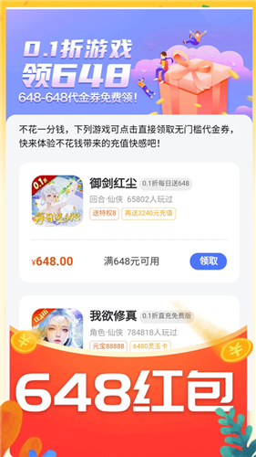哥们儿玩手游不想氪金还想过大佬瘾的话那你可来对地方了,这款0.01折游戏盒子变态版就是咱们游戏玩家的宝藏app。简单说这就是一个游戏超级商场,里面塞满了各种好玩的游戏。无论你喜欢的是带兵打仗的策略游戏、仙气飘飘的玄幻大作、还是轻松休闲的模拟经营,这里全都有绝对能找到你爱玩的那一款。其中最核心的福利是什么呢,那就是打折,在这儿充值能享受最低0.01折的逆天优惠,这意味着你花一点小钱,就能获得别人成百上千才能拿到的游戏资源。这还不够新用户上线直接白送648充值卡,每月月卡免费领,各种道具拿到手软,真正做到零氪也能当大佬,体验爽到飞起。平台还会经常搞活动,动不动就送各种好礼,让你的游戏之路惊喜不断。