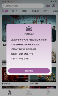 D8影视官方版是一款备受欢迎的免费追剧软件,以其丰富的内容和强大的功能脱颖而出。软件汇聚了国内外海量影视资源,涵盖电影、电视剧、综艺、动漫等多种类型,无论是最新热播剧集、经典老片,还是院线大片、小众佳作,用户都能在这里轻松找到并免费观看。