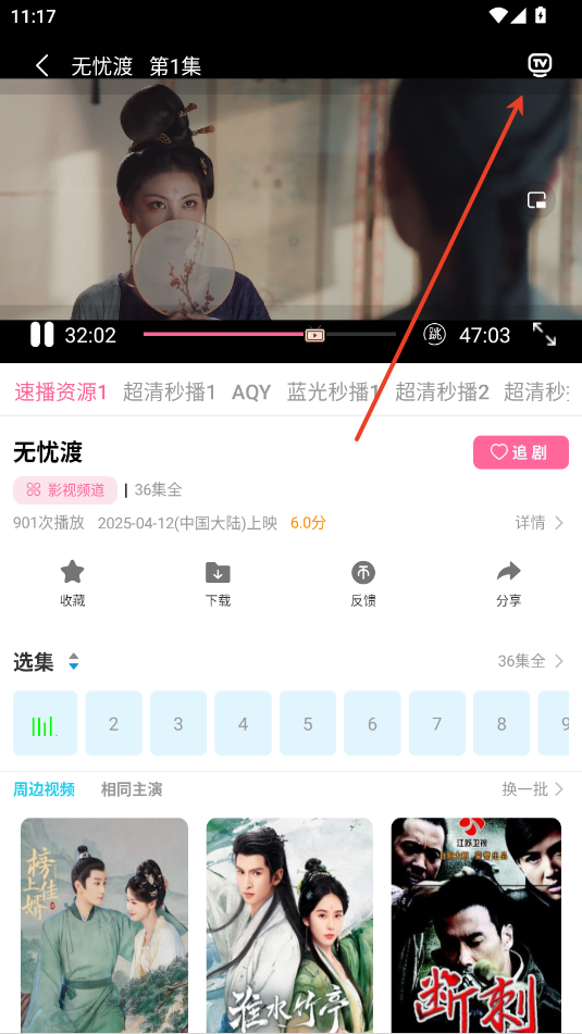 2.点击右上角TV投屏。