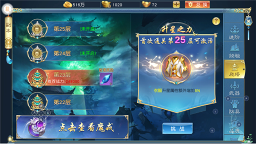 进阶副本每日限制挑战次数,挑战次数可获得重置,通关获取不同奖励,可以用于形象的进阶。