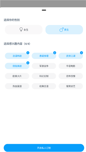 1、进入软件首先选择性别以及感兴趣的影视内容,方便后续给用户推荐感兴趣的影片