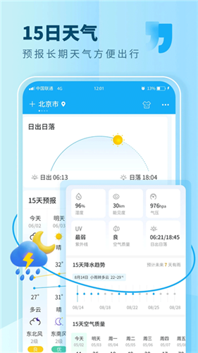 1、可查询未来15日天气预报和生活指数,让您轻易的掌控近期温度变化,便于及时增减衣物,轻轻松松享受生活。2、界面简洁无广告,软件查看天气时不被干扰,操作简单易上手。