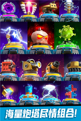 3、超50种炮塔各有专属技能,可开发激光控场、太空飞船压制等流派,搭配自由度极高。