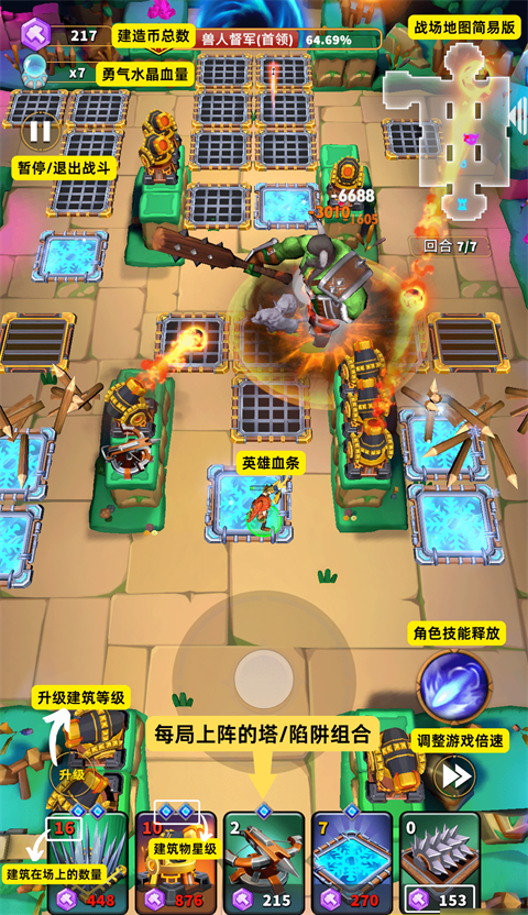 1、游戏开局游戏内只需单手控制英雄移动走位,英雄会自动攻击怪物。消耗建造币来将高塔放置于平台上或是布置地面陷阱来完成你的塔防布局。局内击败头顶带有宝箱的怪物能够获得择的机会。根据你的战斗流派选择合适的词条,让建筑/地形/英雄三者默契配合,应对不随机词条选同的怪物——对局详情示意图。