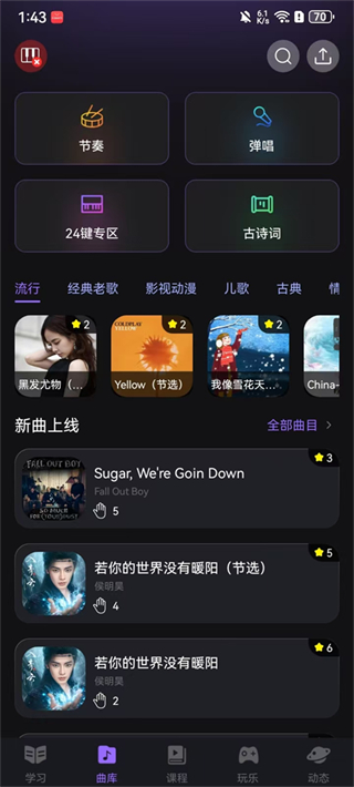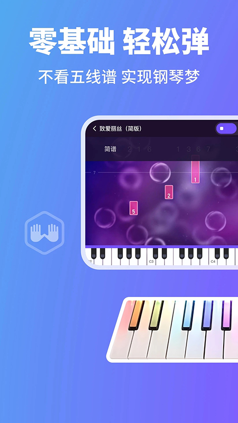 泡泡钢琴官方版是一款零基础学琴软件。这里的曲库超丰富,不只有致爱丽丝这样的经典钢琴曲,还实时更新抖音爆款神曲、孩子爱唱的儿歌、长辈熟悉的老红歌,甚至英文歌单都安排上了。重点是,你不用从枯燥的练习曲开始,直接选自己喜欢的歌学,边听边跟着小箭头弹,手指自然就能记住指法,学琴变得像听歌一样轻松。