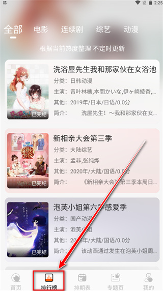 3.点击下方的排行榜,即可看到根据当前热度整理的不定时更新的电影、连续剧、综艺、动漫排行榜单。