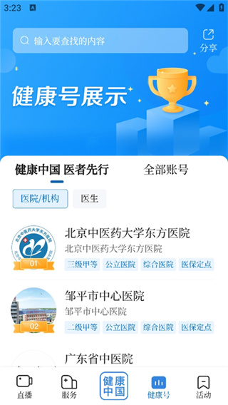 4、点击健康号,里面有很多医院的资料以及排行可供用户咨询。