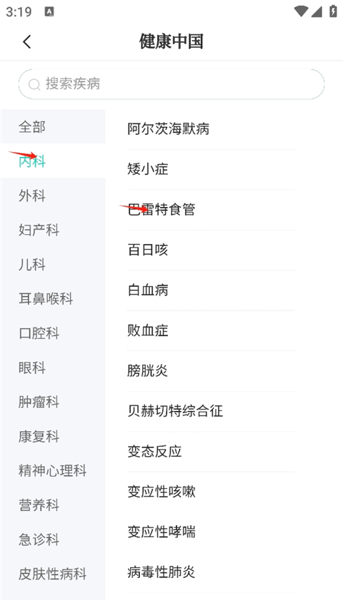 4、小编以内科相关疾病举例,点击内科,点击巴雷特食管;