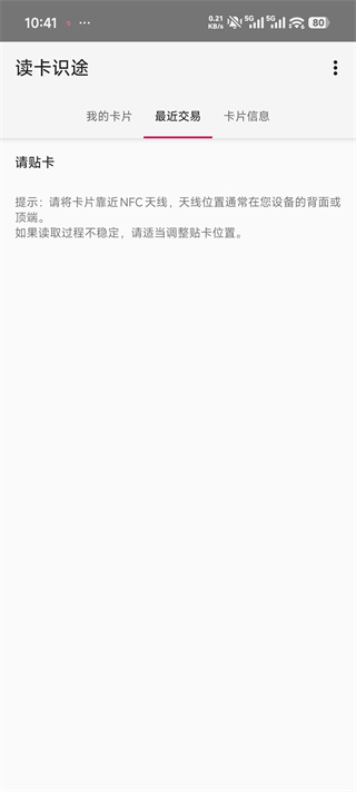 1、进入app的【最近交易】页面,按提示将公交卡贴近设备NFC天线(通常在背面/顶端)即可读取卡片信息。