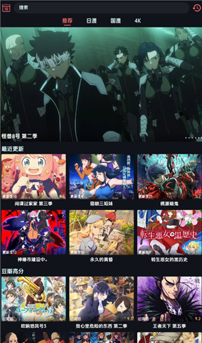 1、平台首页拥有很多热门动漫,如怪兽八号、假面骑士、桃源暗鬼等