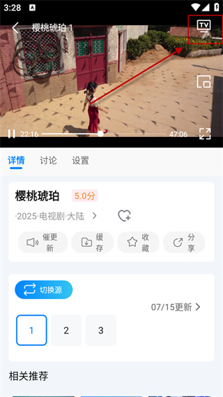 4、打开需投屏的影视,进入播放页面,点击右上角“TV”图标;搜索并选择要投屏的设备,完成投屏。