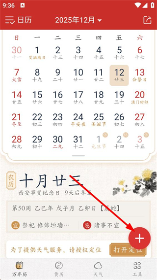 1、进入界面后看到2025年12月的日历展示,包含公历农历日期、宜忌等信息,点击右下角加号按钮,即可进入新建日程的操作页面。