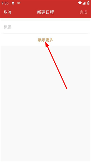2、点击加号后进入新建日程界面,能看到标题输入区域,点击展示更多按钮,可展开更多用于设置日程的相关选项内容。