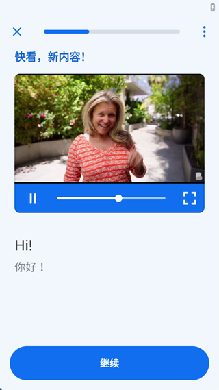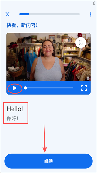2、可以点击“播放”键重新播放,可以认识各种打招呼的单词看看,觉得记住了,可以点击屏幕下方的“继续”。