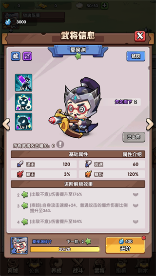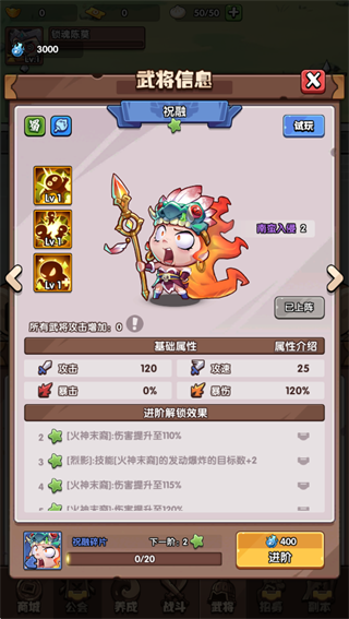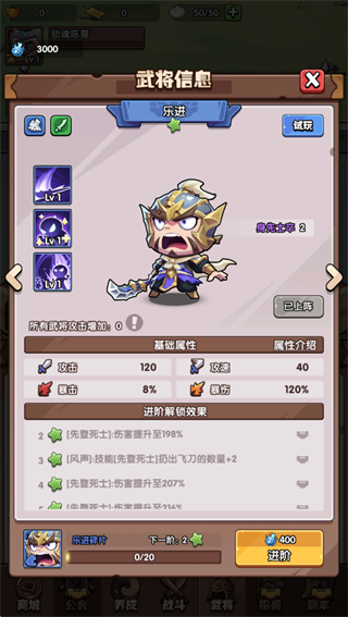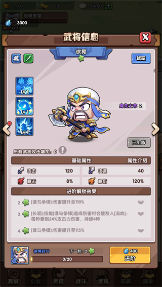 1、离线放置自动成长,忙碌也能轻松收资源升级2、武将突破品阶限制,普通将领也能进阶成传说战神
