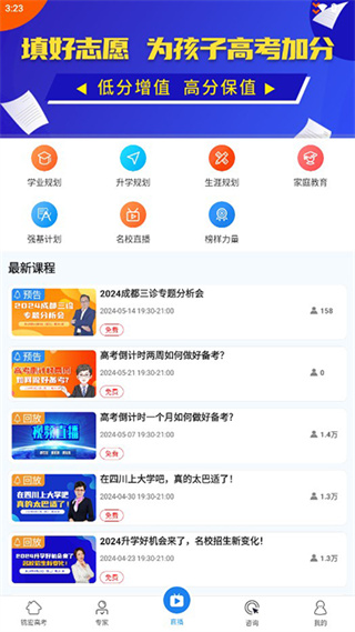 2、我们点击直播的话,可以看到有非常多的升学规划、学业规划、职业规划等等视频,用户可以免费观看
