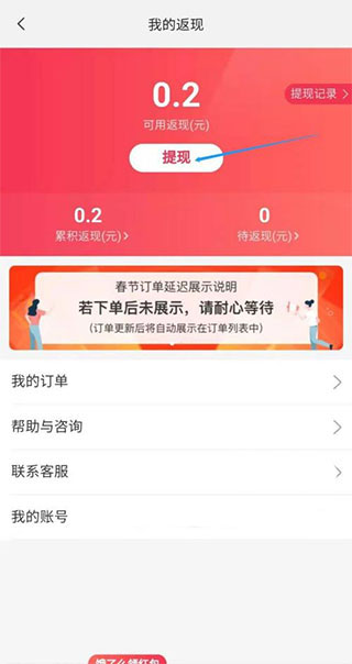 3、在我的返现页面点击提现