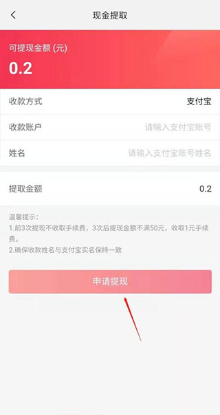 4、输入收款的支付宝账号和姓名,点击申请提现即可