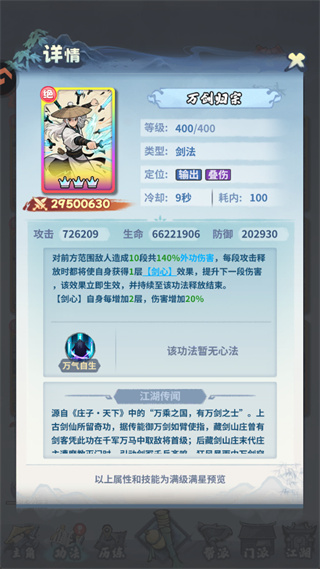 1、万剑归宗对前方范围敌人造成10段共140%外功伤害,每段攻击释放时都将使自身获得1层【剑心】效果,提升下一段伤害,该效果立即生效,并持续至该功法释放结束。