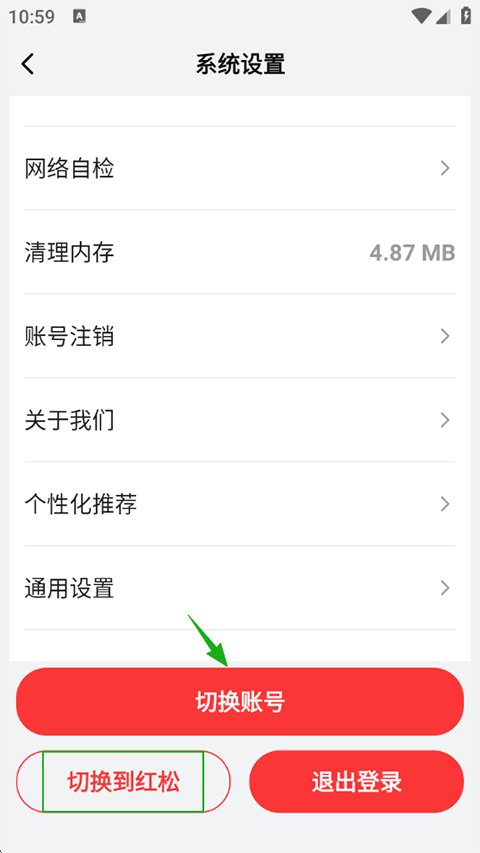 5、在系统设置页面下方找到切换到红松,若您想要切换微信号登录,需要先点击退出登录再用新微信账号扫码登录。