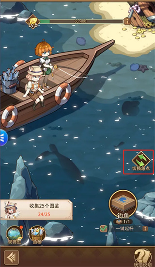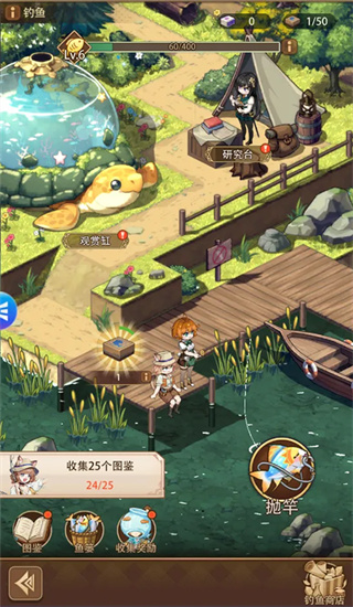 钓鱼玩法,消耗鱼饵在不同的地图获得不同的鱼和奇物,不同的鱼和奇物放入观赏缸中可以获取不同的加成。