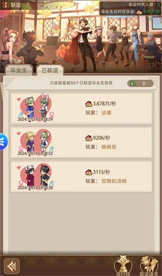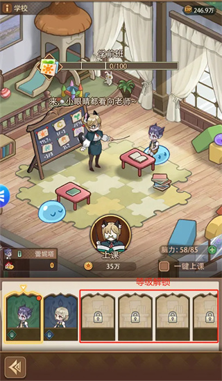 学校玩法同前面的家人玩法是联动的,我们通过等级提升解锁学校的座位,每个座位的脑力是单独计算的,所以座位越多越好。消耗脑力获得教学进度,教学进度满值后毕业进入联谊,联谊成功获得更多的村庄收益加成。