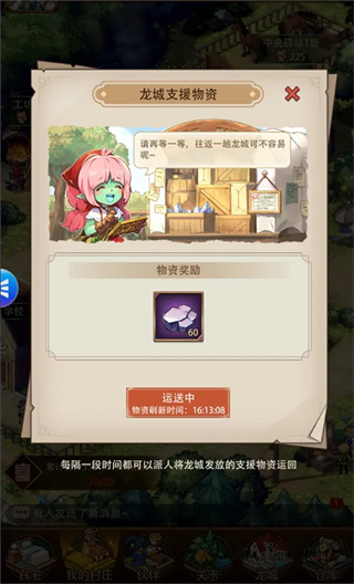 在村庄界面图示红色框位置,可以进行龙城支援物质运输,运输物质就是奖励物质,物质随机,点击运输需要16小时才能完成,完成后获得奖励。