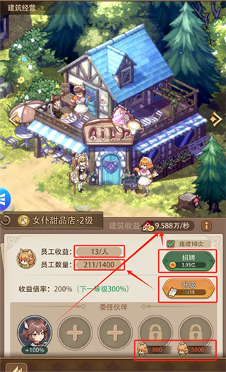 建筑可以使用道具进行等级提升,越后期的建筑员工收益越高,可以通过消耗金币招聘普通员工,普通员工数量达标后解锁委任伙伴的数量。