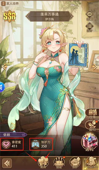 Tips:亲密度对孩子有养成增益,亲密度高还可解锁特殊剧情CG;加护力提高可以提高约会获得的加护点数,加护点数可提升家人的技能等级,用于提升伙伴战斗力。