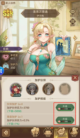家人养成及约会,家人对于村庄收益及提升伙伴战力有着重要的作用,其两项重要的属性是亲密度和加护力。
