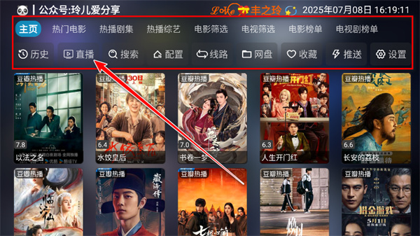 1.打开app,可以看到首页上方有着热门电影、热播剧集、热播综艺、直播等板块内容,点击直播,即可看直播频道。