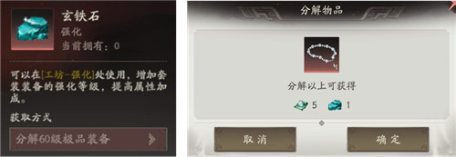 玄铁砂相对易获得,商店已经有各种兑换方式。玄铁石目前似乎只能通过分解60等级以上的红装进行分解才可获得。