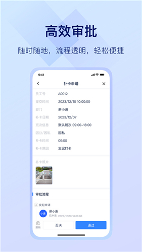 4、全流程移动审批:请假、报销、申请在线完成,审批进度实时可查。