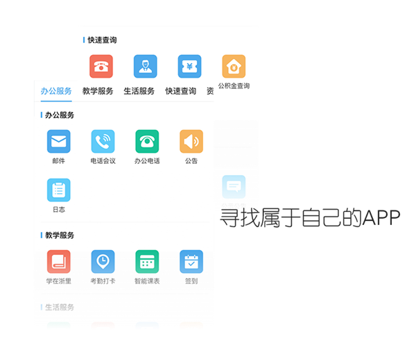1、首页:登录app查看办公服务、教学服务、生活服务、快速查询、资讯......