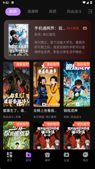 2、在剧场页面提供各种精彩的漫剧,还有漫谭榜、高燃、热血战斗、奇幻冒险等不同的分类;