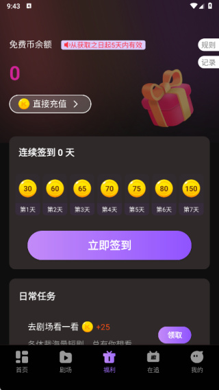 3、在福利页面中提供连续签到的金币,同时可以直接充值各类金额;