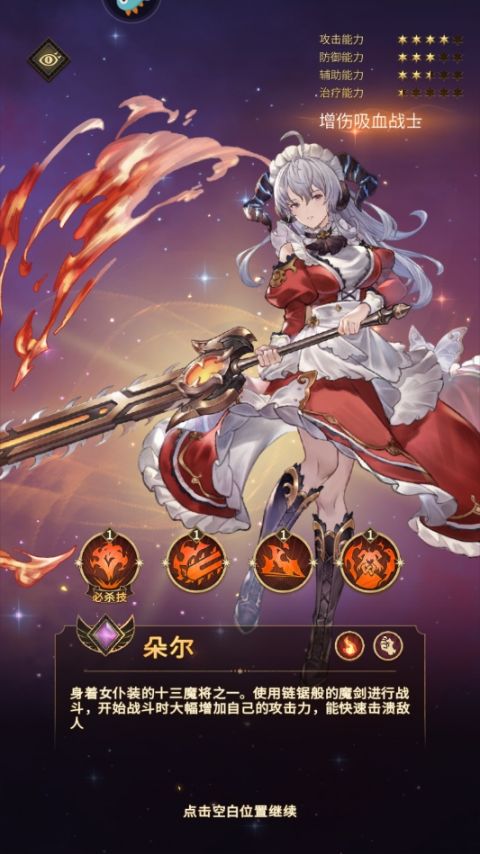 身着女仆装的十三魔将之一。使用链锯般的魔剑进行战斗,开始战斗时大幅增加自己的攻击力,能快速击溃敌人