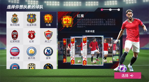 一、球队选择阶段选择你想执教的球队,可挑选如 “红魔” 等风格各异的球队,不同球队有独特当家球星和背景,选队时可结合自身对球队风格的偏好来决定。