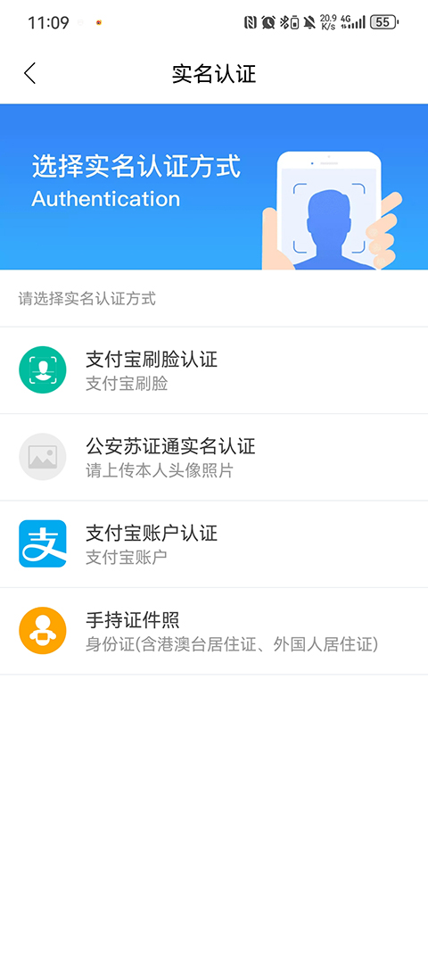 3、登录账号后需要市民认证,有四种方式进行认证。