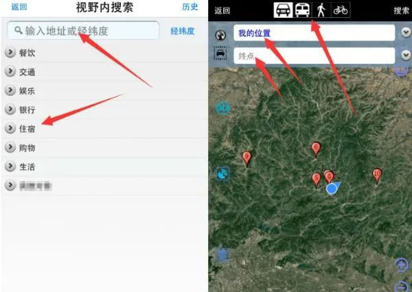 1、搜索,快速搜索附近餐饮、交通和银行等等,也可手动输入搜索并确认搜索位置;