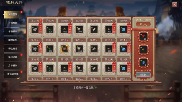 领取每日签到、在线奖励等内容,累计签到天数能领取不同奖励。