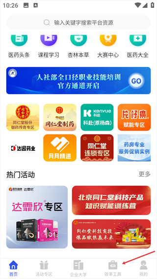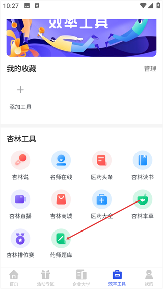 2、在【效率工具】页面,找到【药师题库】功能入口。